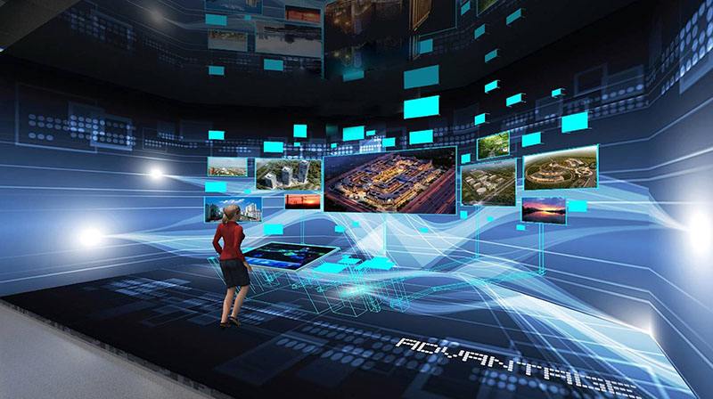 使用多臺投影機投射環形影院,觀眾身處環幕中間,視覺完全被包圍,再配合環繞立體聲系統,使觀眾充分體驗一種高度身臨其境的三維立體視聽感覺,獲得一具有高度沉浸感的可視環境。